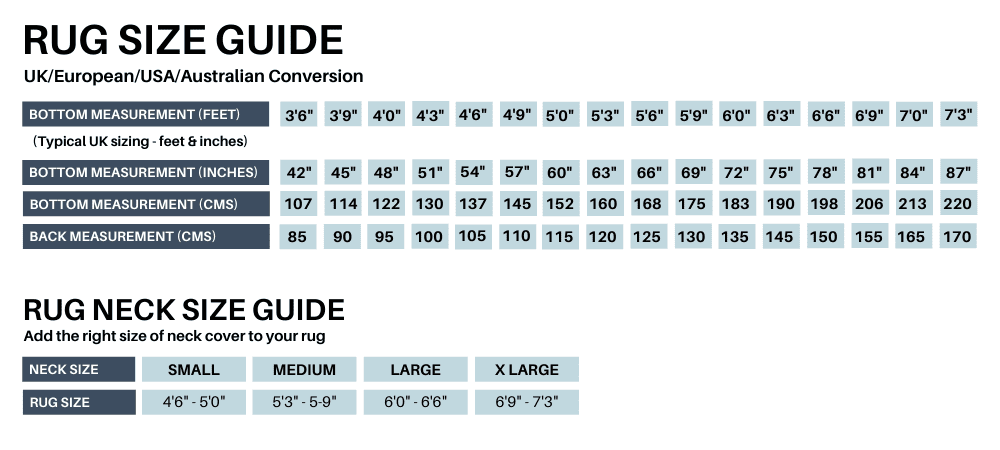 Measure your horse properly to check which rug size he needs. To do this, take a soft tape measure (and a helper!), popping one end at the centre of the chest and measuring along the body to the rear. Take the measurement in either inches or centimeters and use our chart below to convert to the rug size in feet.
