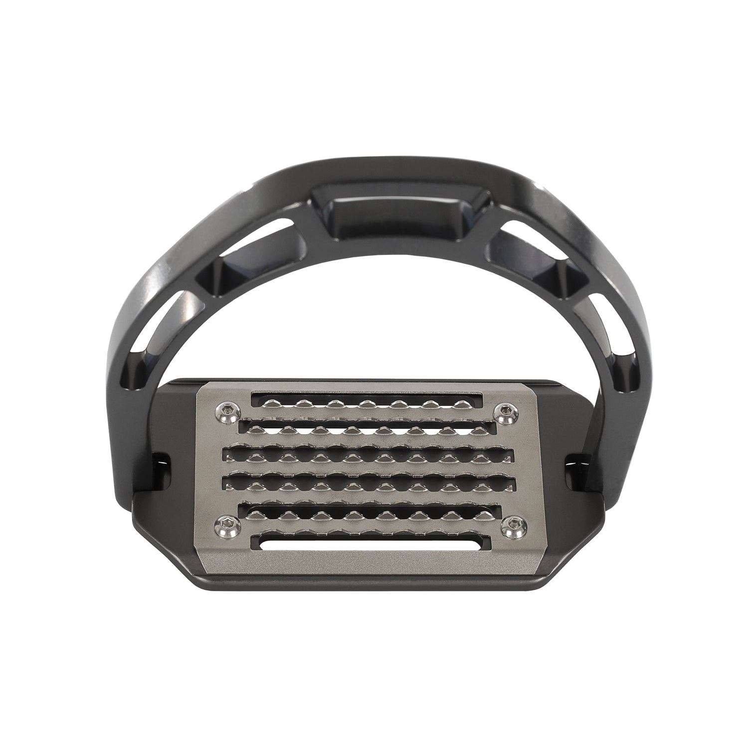 >The upper footbed is made of stainless steel, with long horizontal holes. The 5° inclined tread helps riders to assume the correct posture, relieving tension in the ankles, calves, knees and hips.