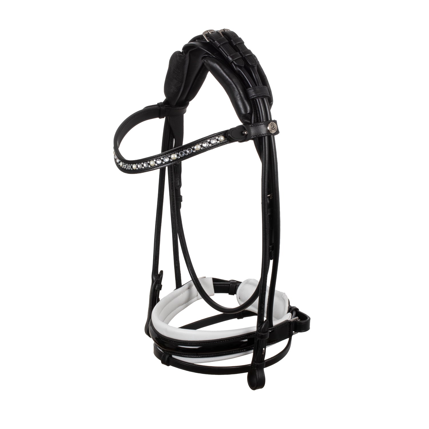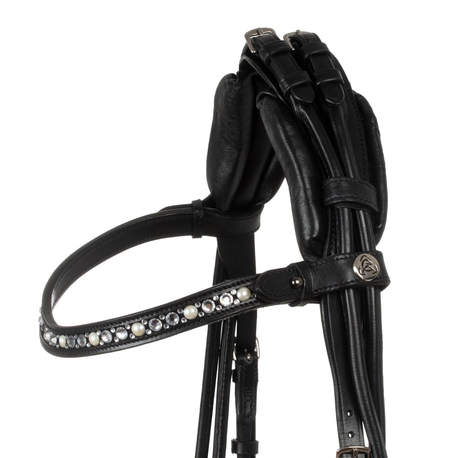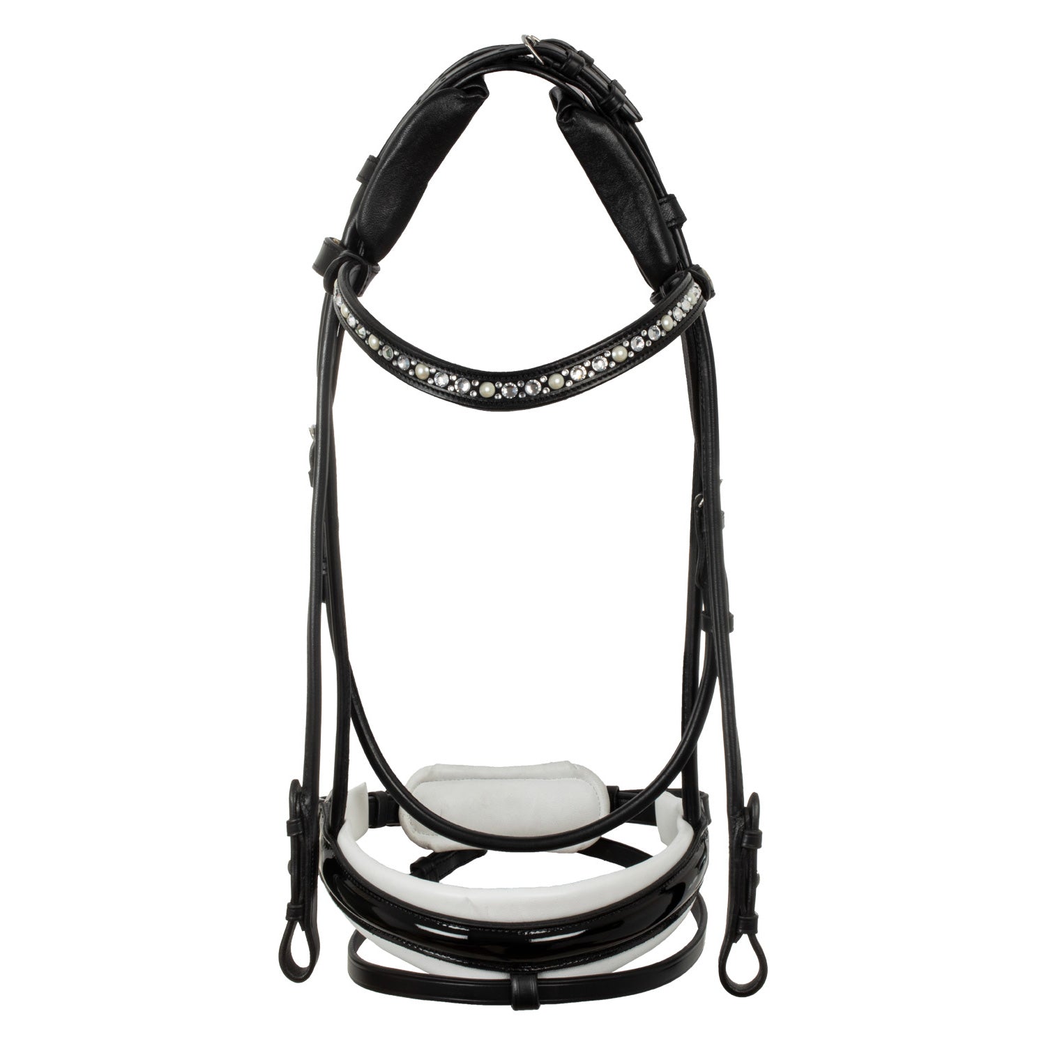 >The elegant browband is characterized by white rhinestones, adding a touch of luxury and sophistication. The adjustment is located on the headpiece, for a clean and elegant look.