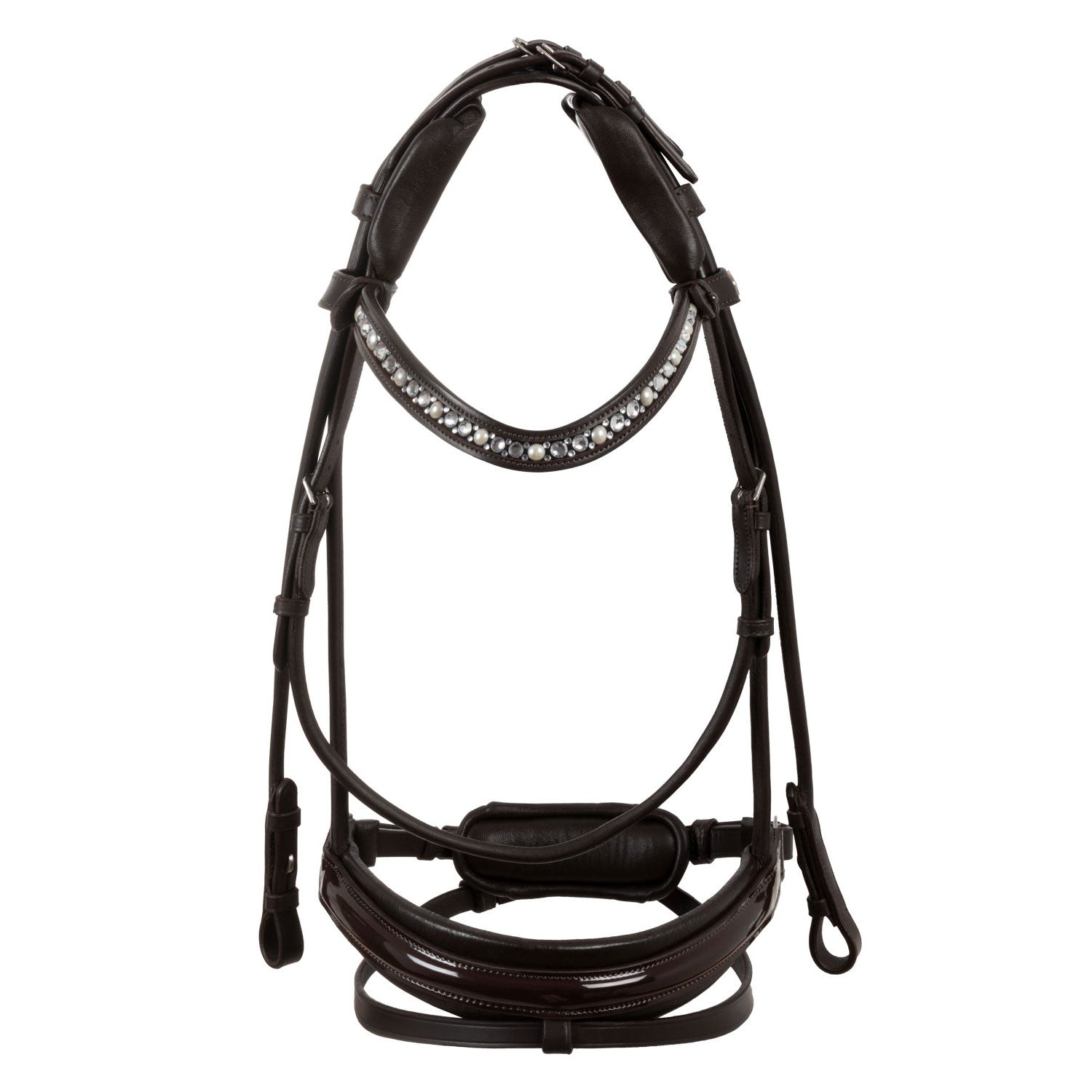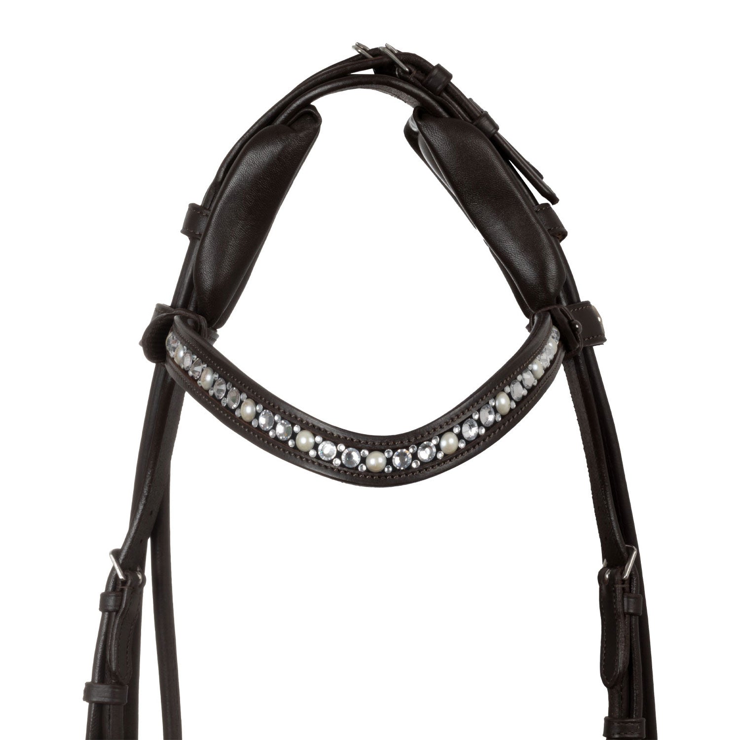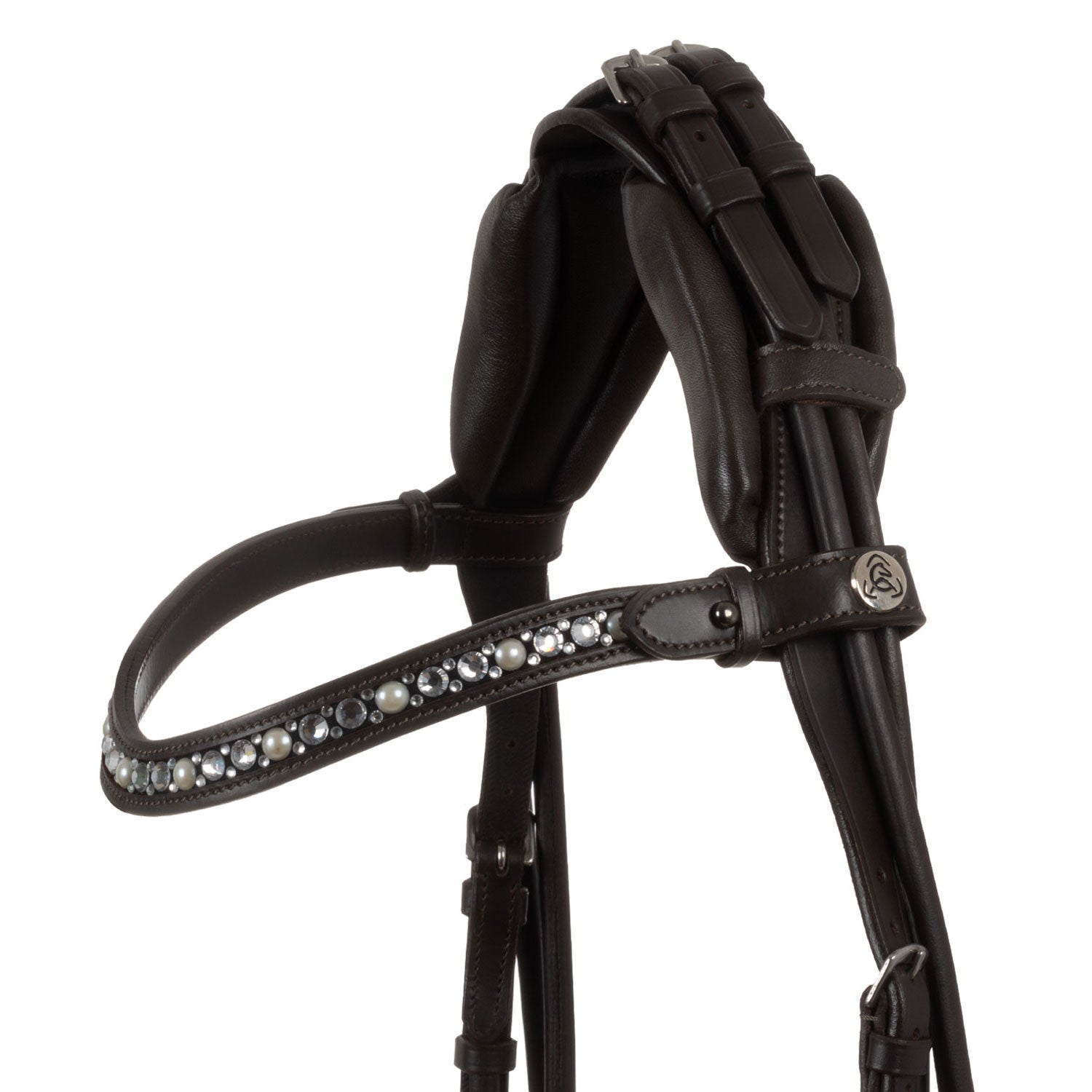 >The elegant browband is characterized by white rhinestones, adding a touch of luxury and sophistication. The adjustment is located on the headpiece, for a clean and elegant look.