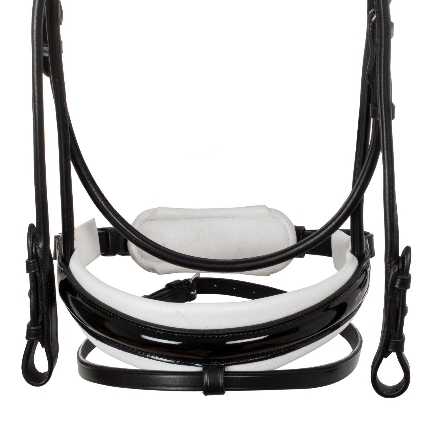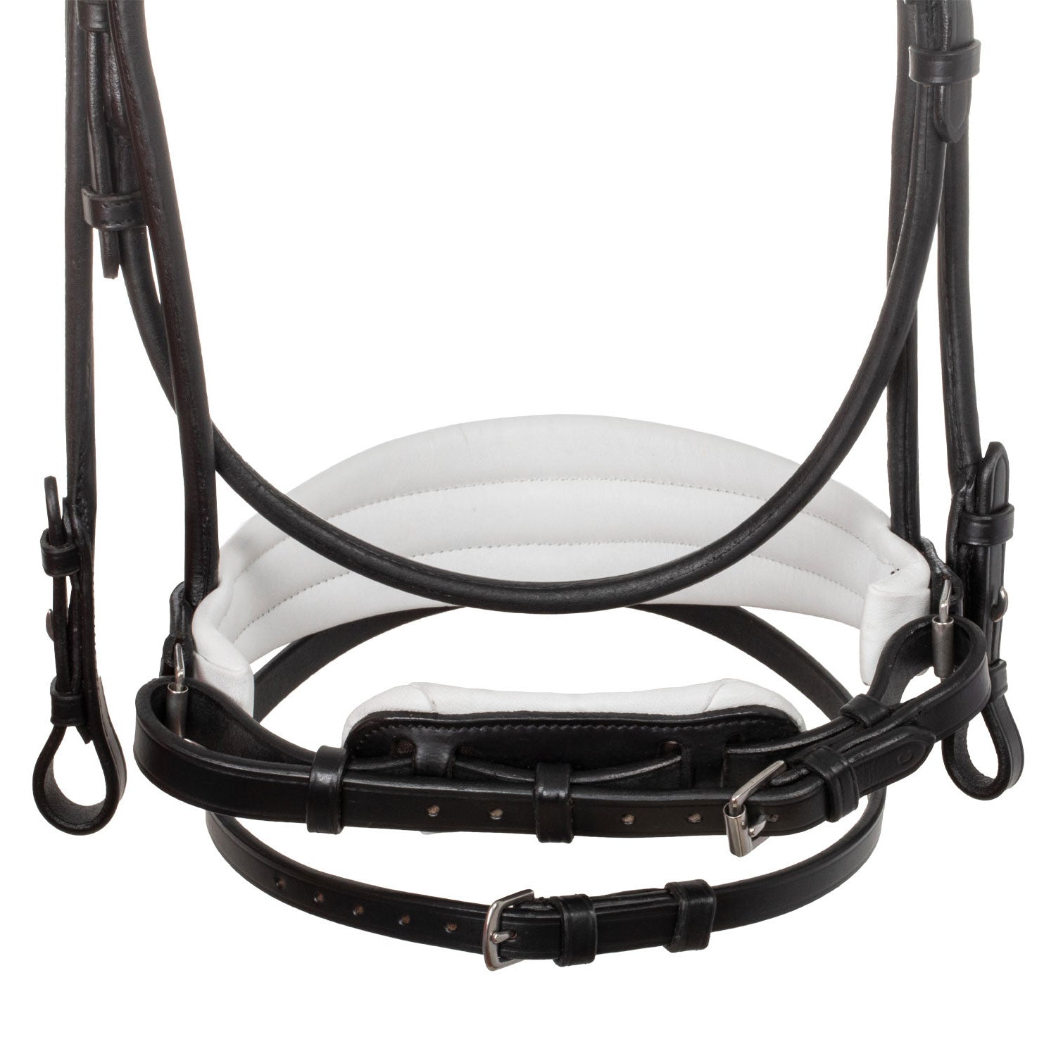 >The padded noseband featuring a white, black or brown piping, gives the bridle a refined and sophisticated design.