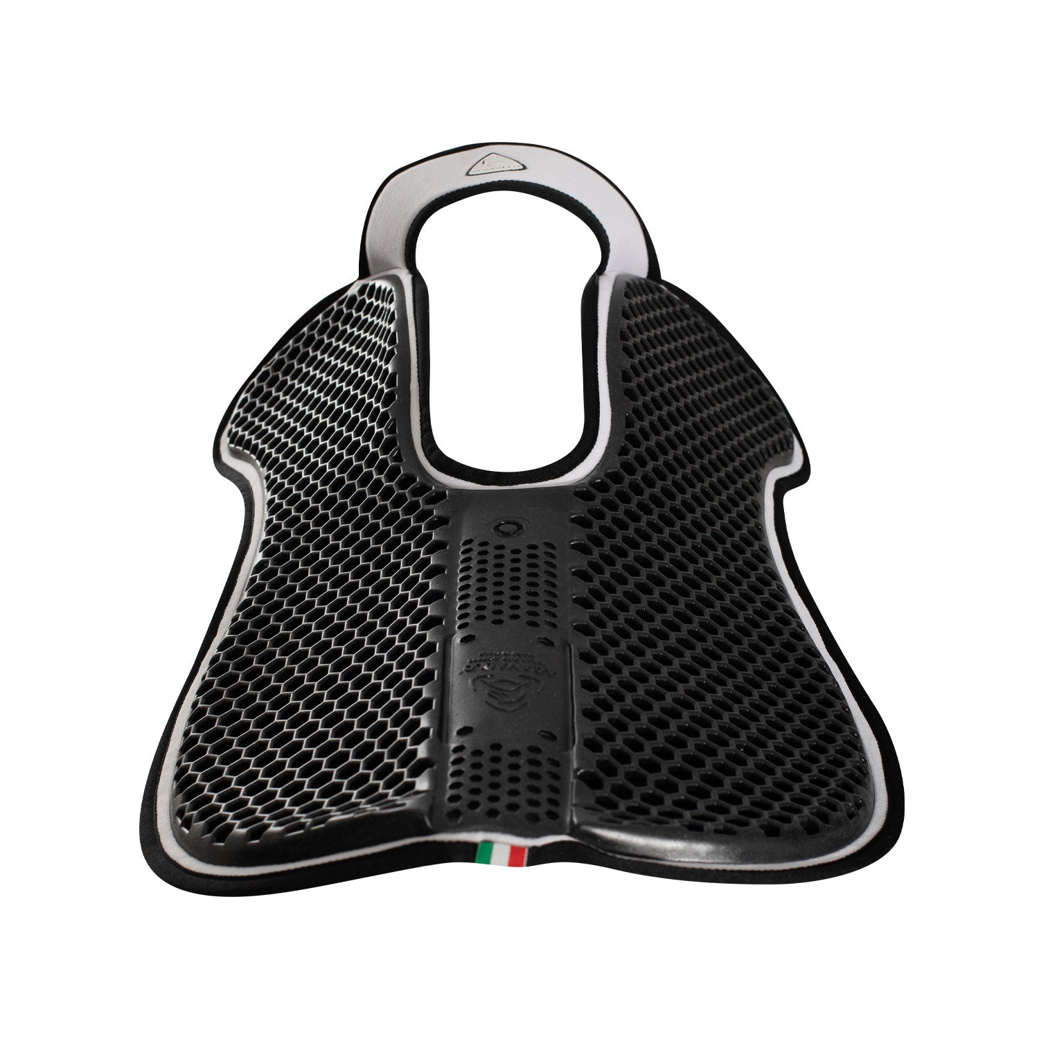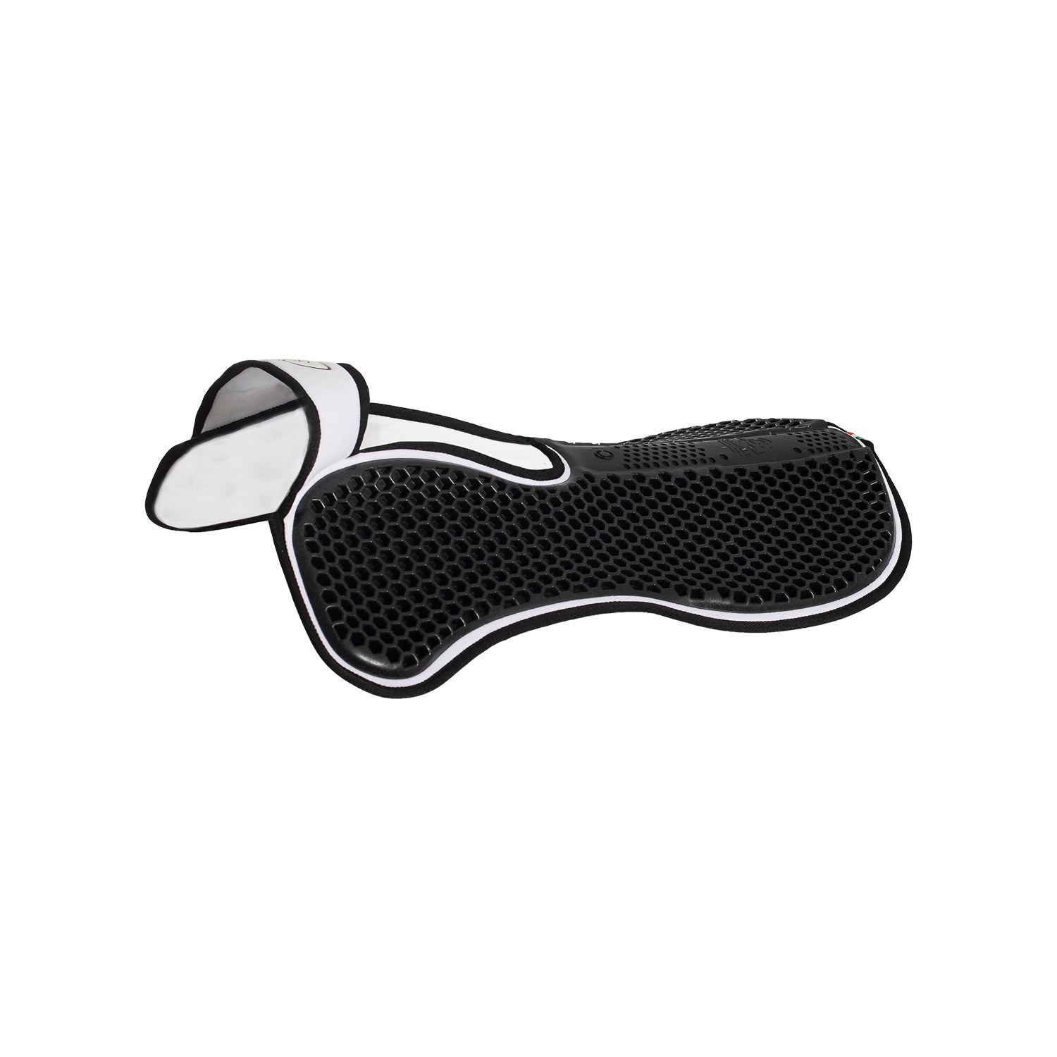 This pad features a non-slip hexagon-shaped gel structure, combined with a suede fabric on the lower surface and a 4mm thick internal open cell foam. This combination offers breathability and optimal cushioning for the horse's back.