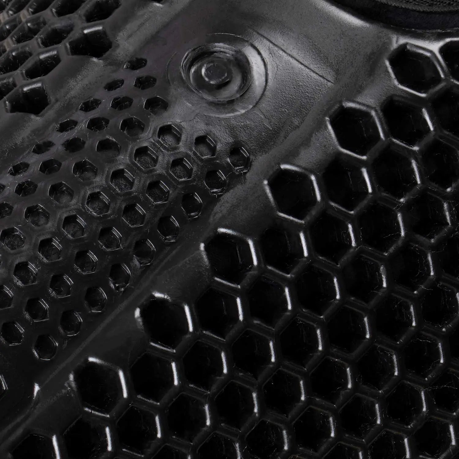 >The hexagonal structure of the gel compresses and releases air during the horse's movements, creating an air cushion under the saddle and adapting to different sizes and styles of English saddles.