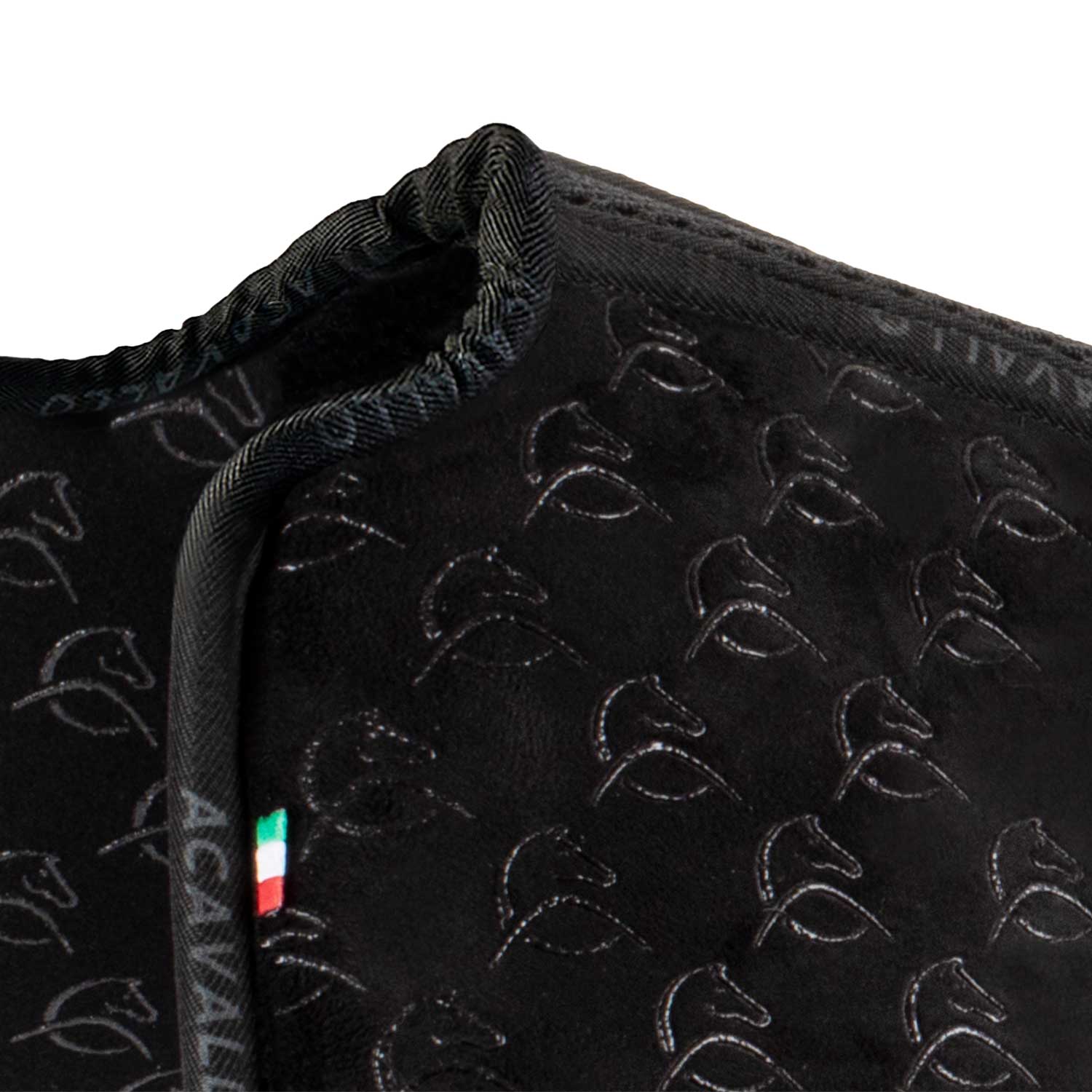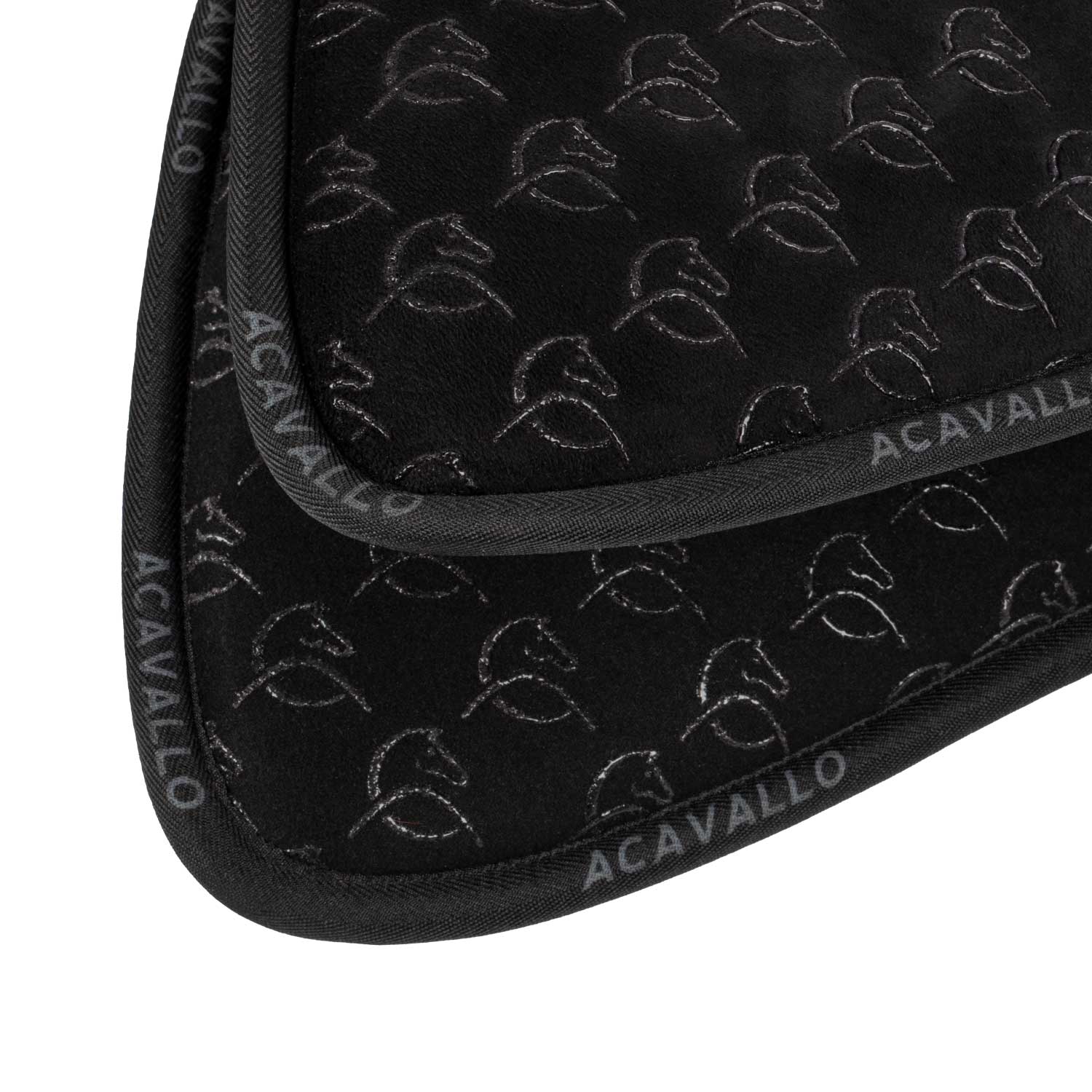 Acavallo® dressage shape memory foam flat pad with shaped withers and 3D spacer spine covered in suede with internal silicone grip. It combines the shock-absorbing properties of memory foam with a tapered shape that ensures deep contact of the pad to the horse's back.