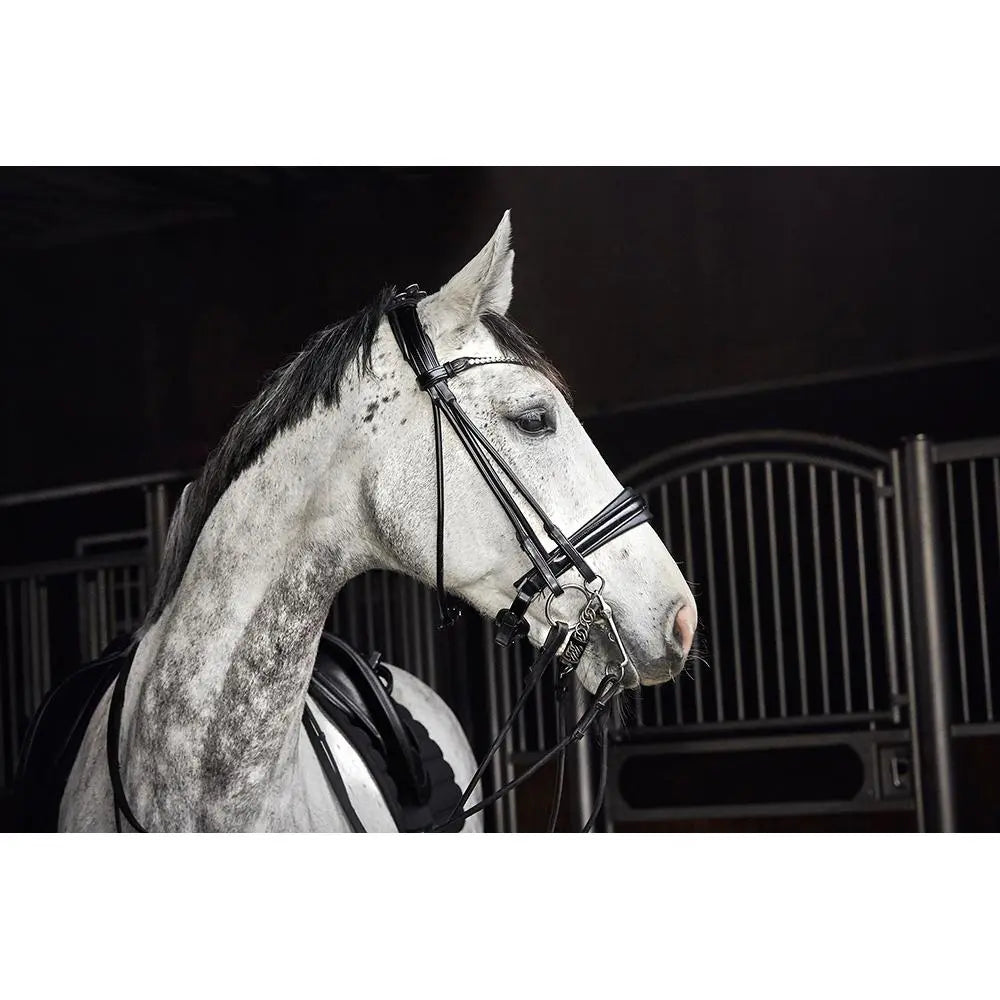 Both head piece and nose band are fitted with a thick memory foam padding covered in soft calf skin to alleviate poll pressure and prevent compression of the sensitive facial nerves surrounding the cheek bones and upper jaw.