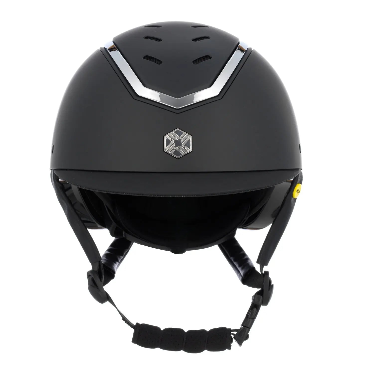 The Charles Owen EQX Kylo Black Matte & Silver Gloss MIPS Adjustable Riding Hat must for standing out in the arena! This helmet is navy matte with Silver gloss halo for a truly sleek look with the addition of MIPS for improved protection.