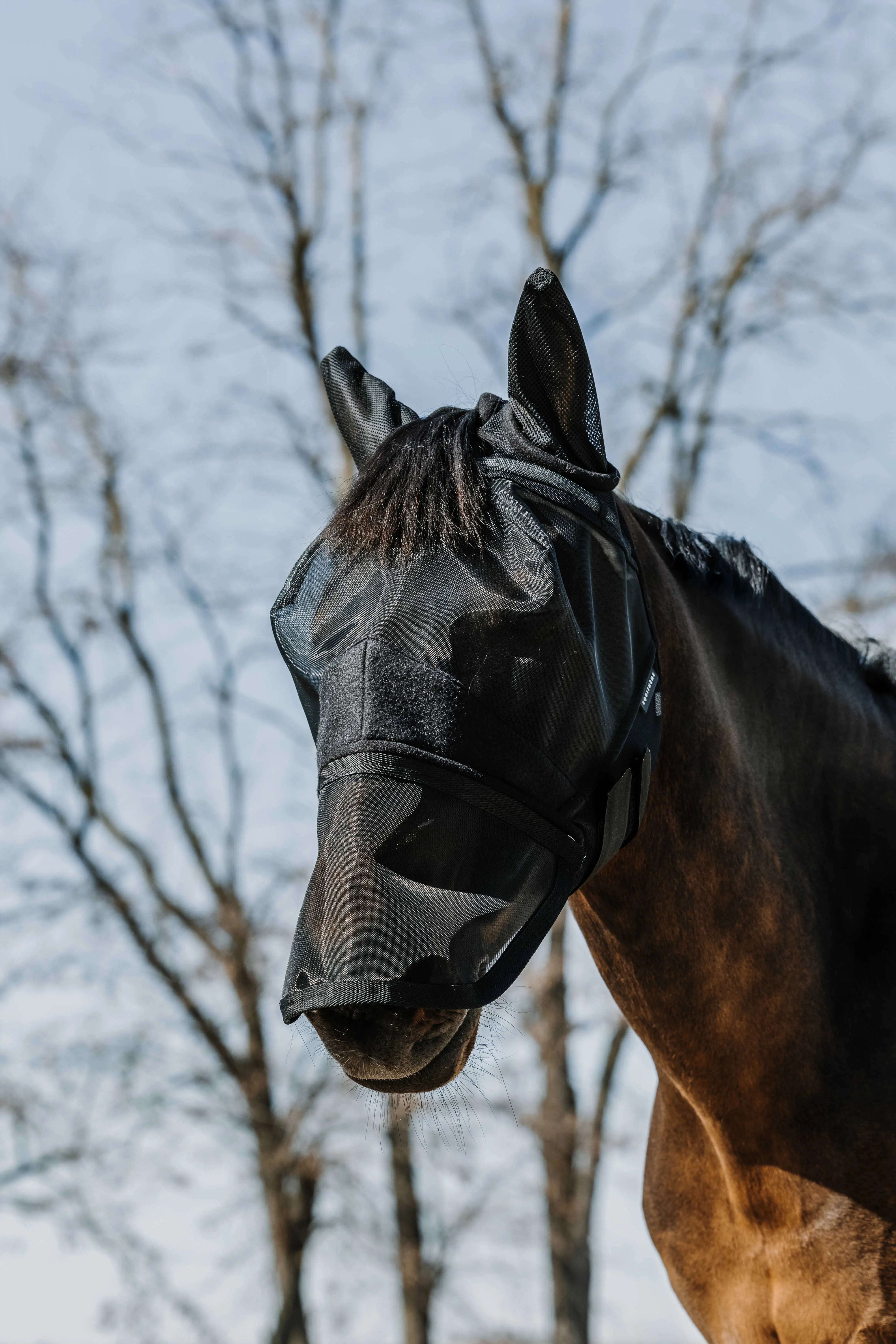 A touch of fleece for ultimate comfort. - Effective Protection: Shields against insects and sunlight with UV 50 protection. - Breathable: Made of mesh fabric with mesh ears. - Soft & Comfortable: Fleece edging and a synthetic sheepskin-lined browband for maximum comfort. - Practical & Adjustable: Secures under the jaw with two hook-and-loop fasteners. DETAILS: - Removable nose protection with a zip closure. - Opening for the forelock.