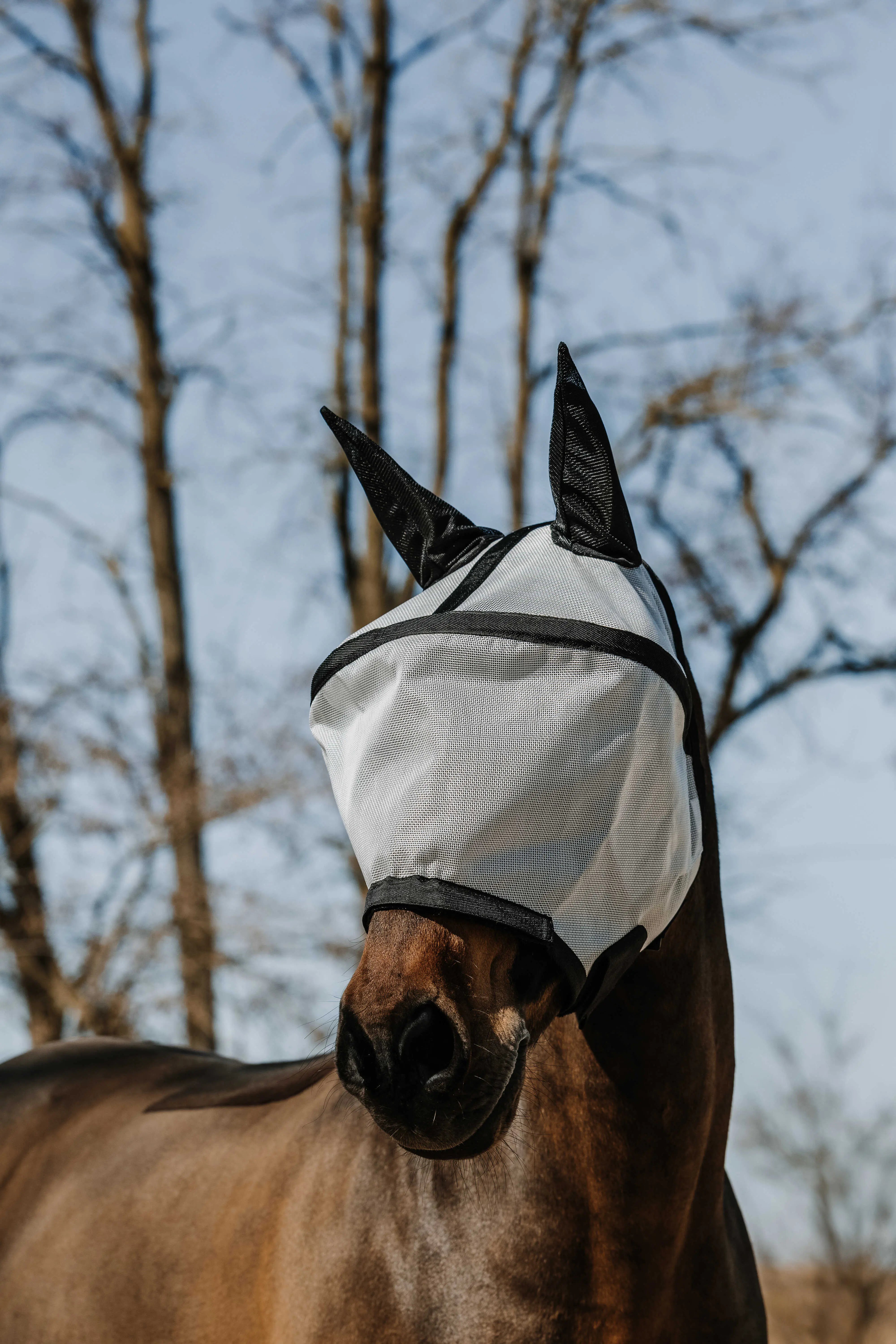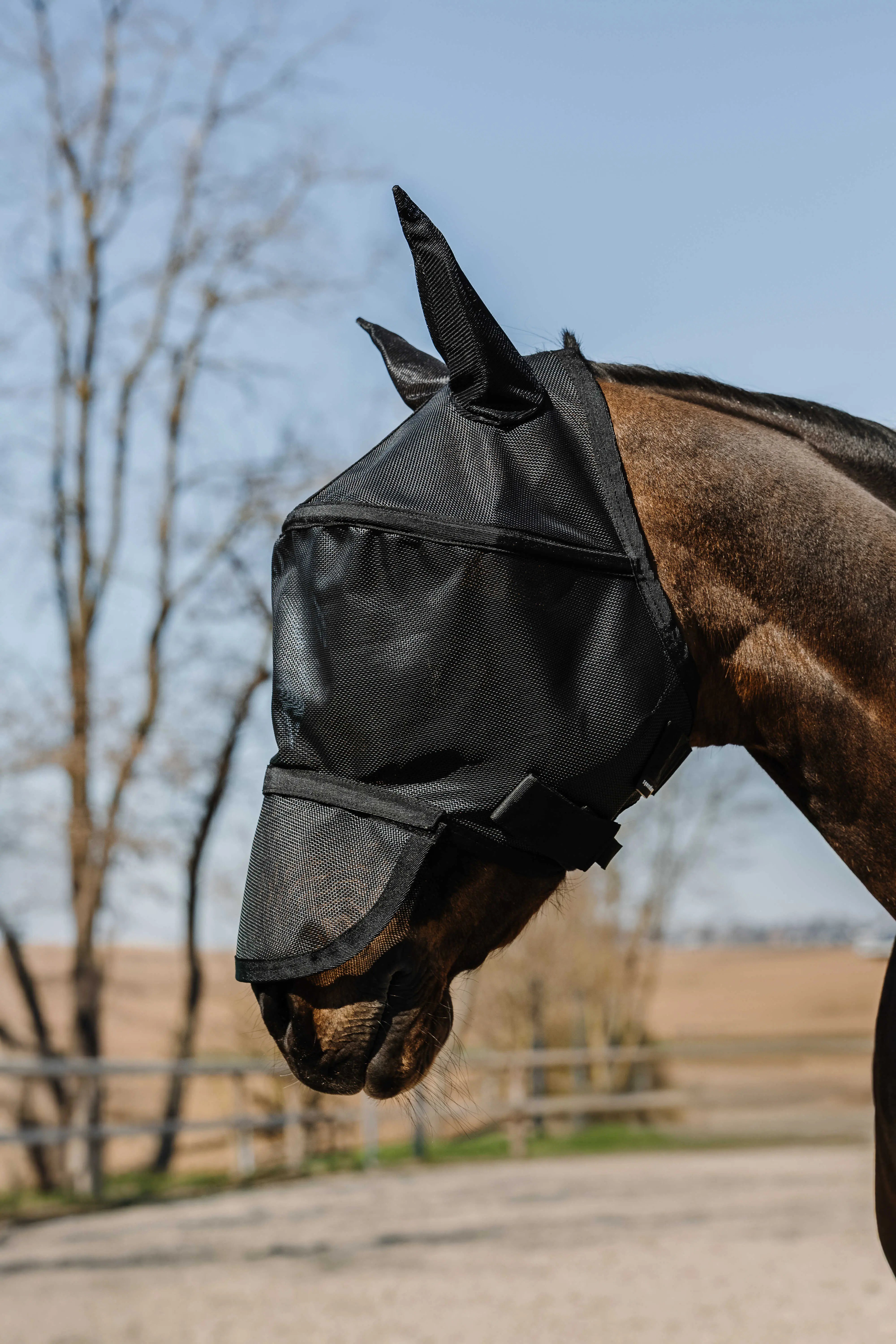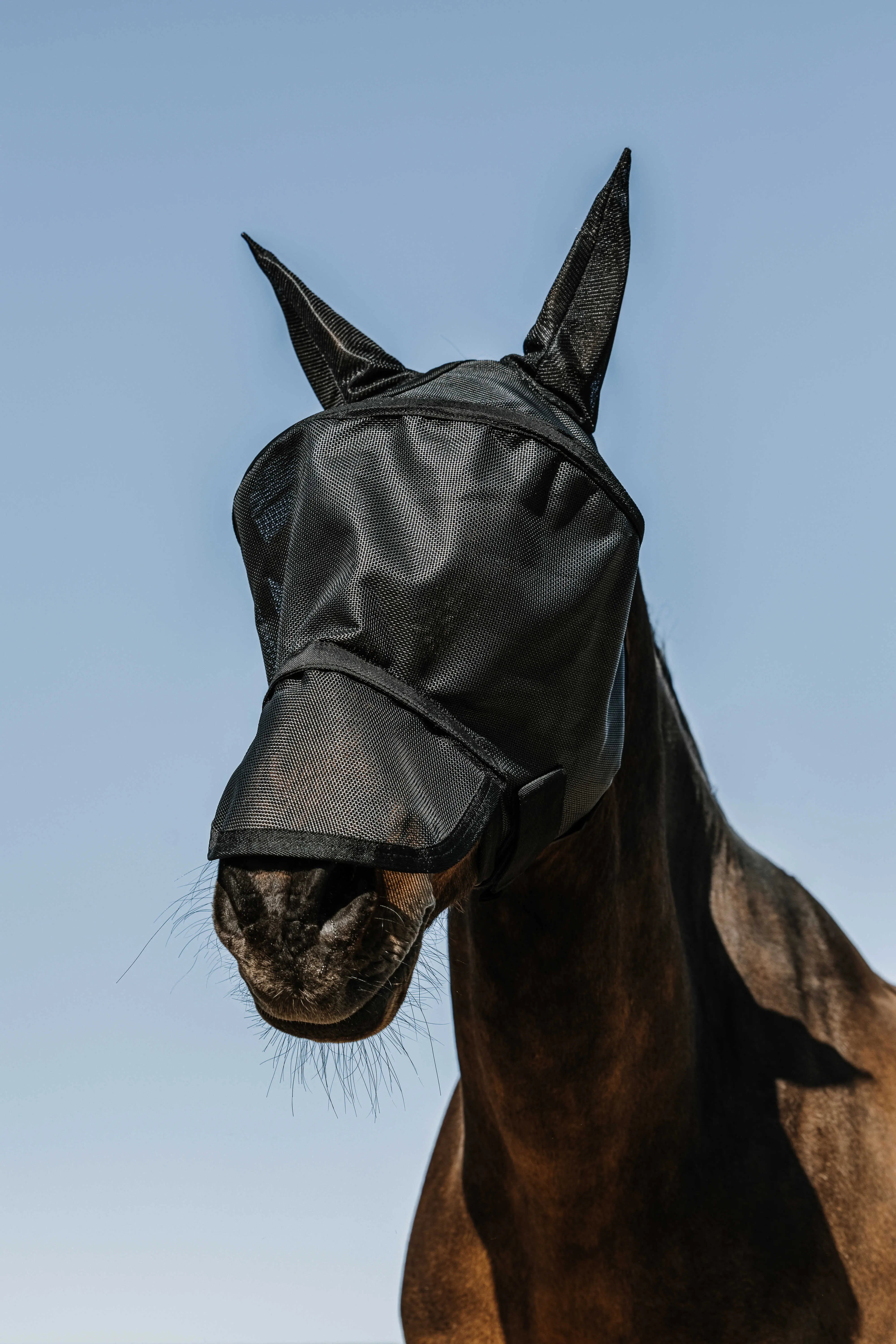 The perfect blend of comfort and complete protection for the horse. - Effective Protection: Shields against insects and sunlight with UV 50 protection. - Optimal Comfort: Arched structure keeps the mask away from the horse's face to prevent rubbing on the eyes. - Adjustable Fit: Secures under the jaw with two hook-and-loop fasteners. DETAILS: - Removable nose protection with hook-and-loop fastening.