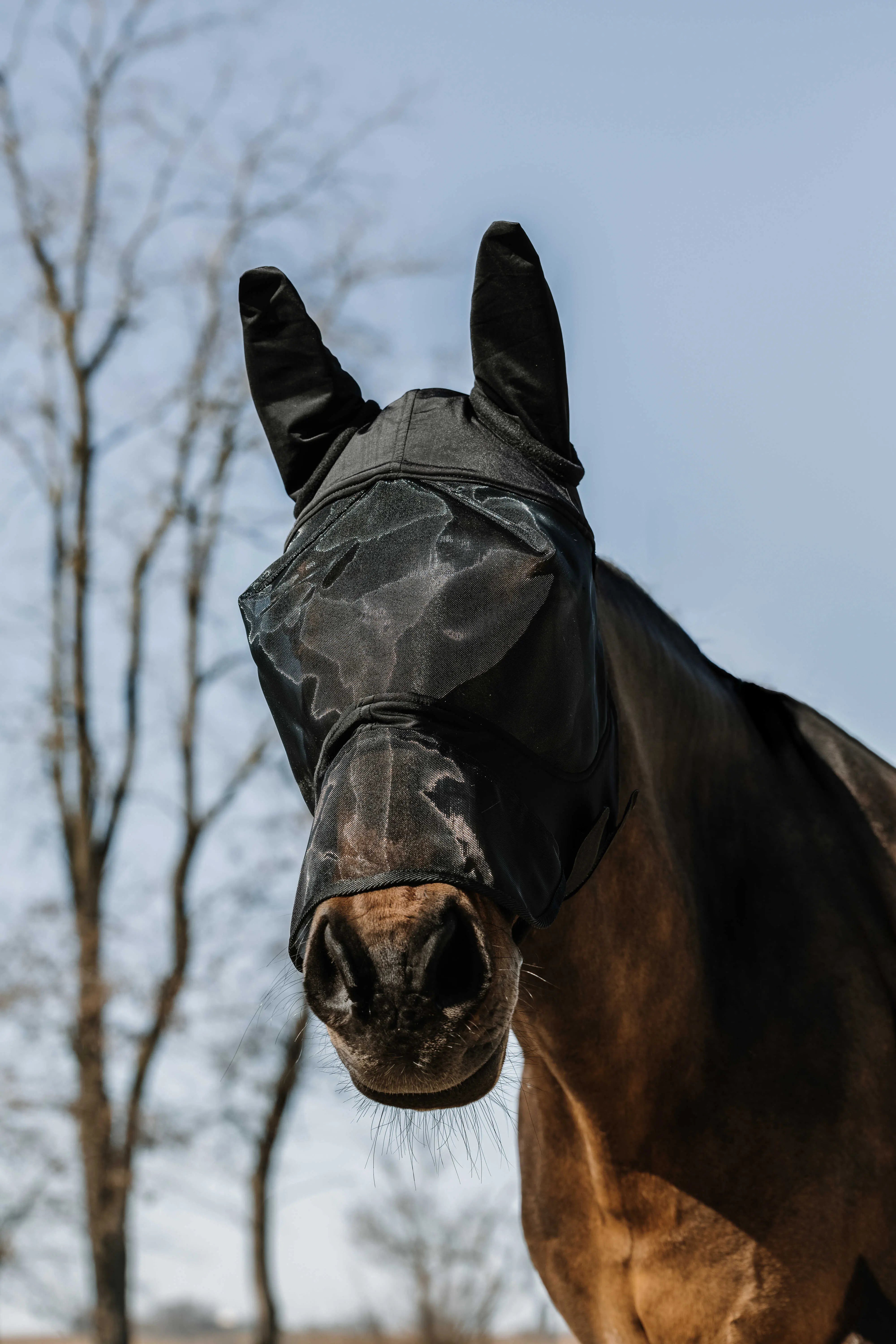 A perfect balance of lightness, comfort, and an optimal fit. - Effective Barrier: Shields against insects and sunlight with UV 50 protection. - Perfect Adaptation: Made of mesh fabric on a Lycra base to contour the horse’s head. - Adjustable: Secures under the jaw with two hook-and-loop fasteners. DETAILS: - Integrated, non-removable nose protection. - Soft & Comfortable: Fleece edging for a gentle, pleasant feel.