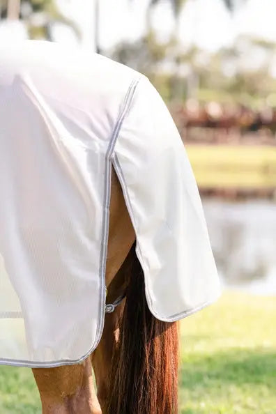 Front leg arches allow for greater freedom of movement while double straight front closure, two adjustable cross surcingles, and tail string keep the fly sheet securely in place. Shine-enhancing lining on the mane, shoulder, and tail flap help reduce friction.
