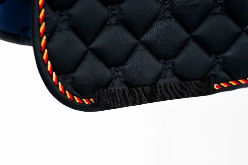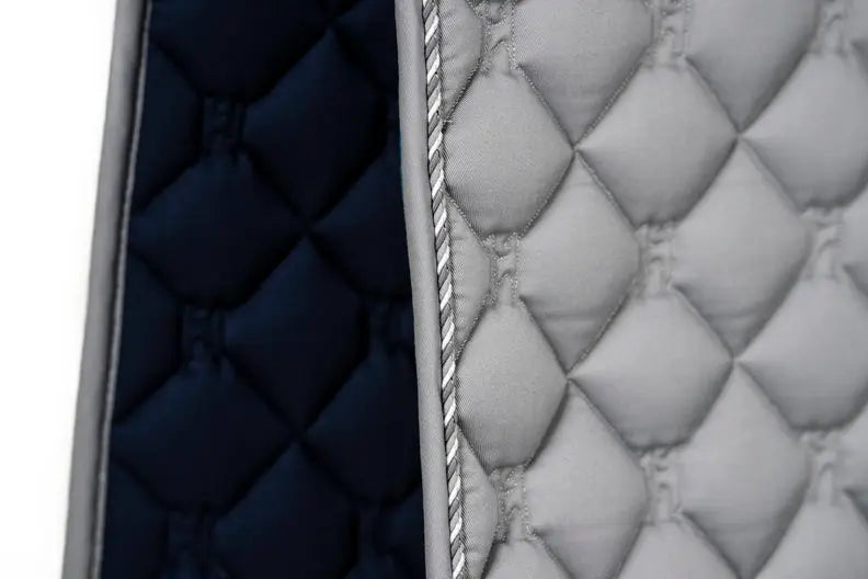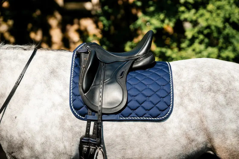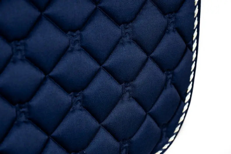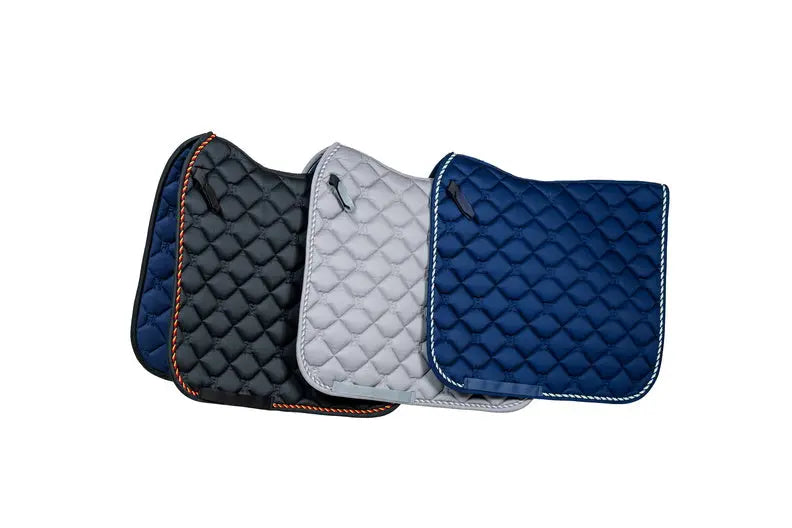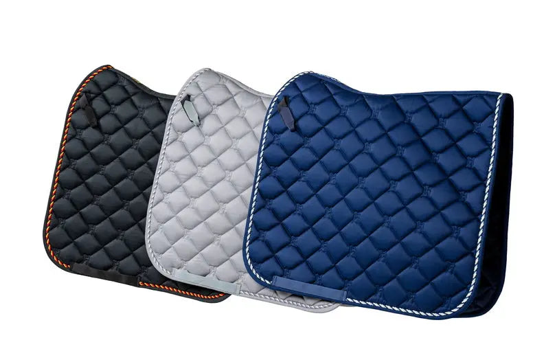 Made of durable polycotton fabric for long-lasting wear, the lightweight and breathable pad features a cool mesh lining to keep your horse dry and comfortable. Contoured design provides wither and spinal clearance, and stays securely in place with D-ring tabs and girth strap. Subtle logo quilt design and twisted cording detail add effortless style.