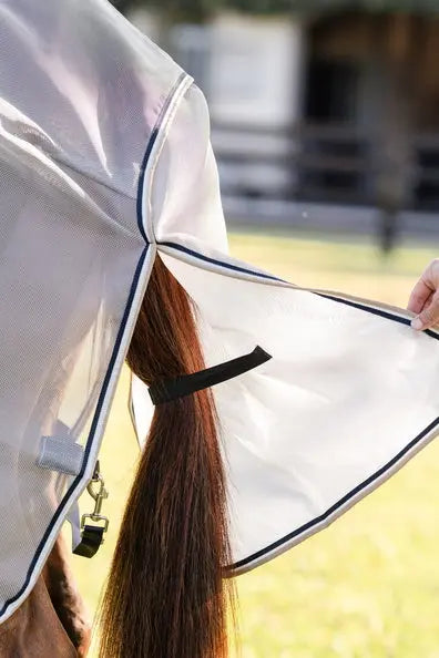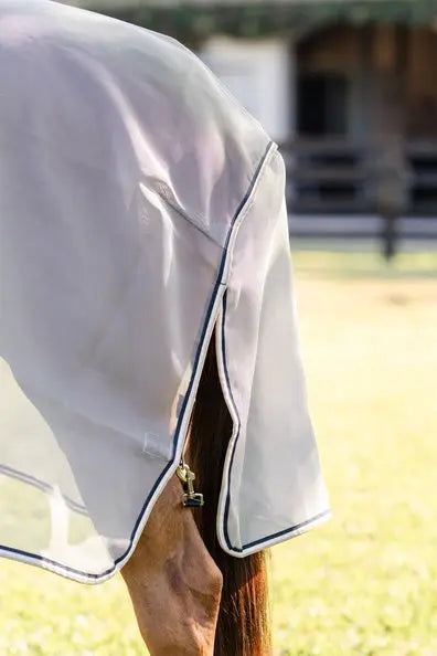 Extended chest, knee, and hock coverage plus extra wide belly band and oversized tail flap offer maximum protection against flies and insects. Our V-Front Closure relieves pressure, helps prevents shoulder rubs, and, coupled with dual leg arches, enables your horse to graze and move around in turnout more comfortably.