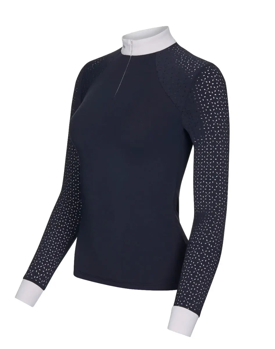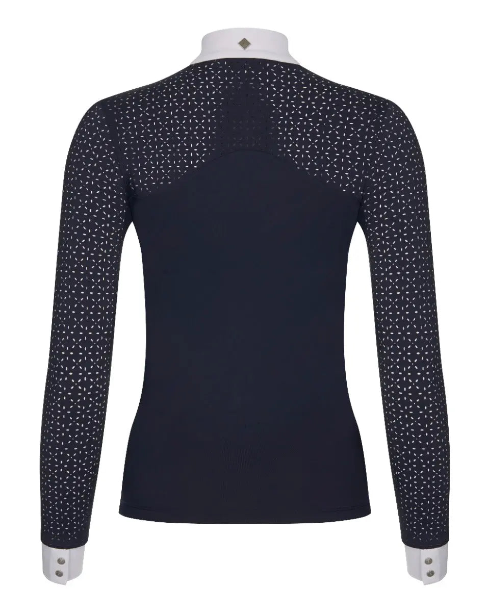 Designed with beautiful detailing, this elegant show shirt is comfortable to wear beneath your show jacket and gives that special feel for confidence when you need it. It features a white collar and cuffs, with laser-cut lace sleeves and back yoke panel for pretty detailing and a cool, breathable feel. Subtle diamante detailing, invisible zip front closure and snap button cuffs add to the look.