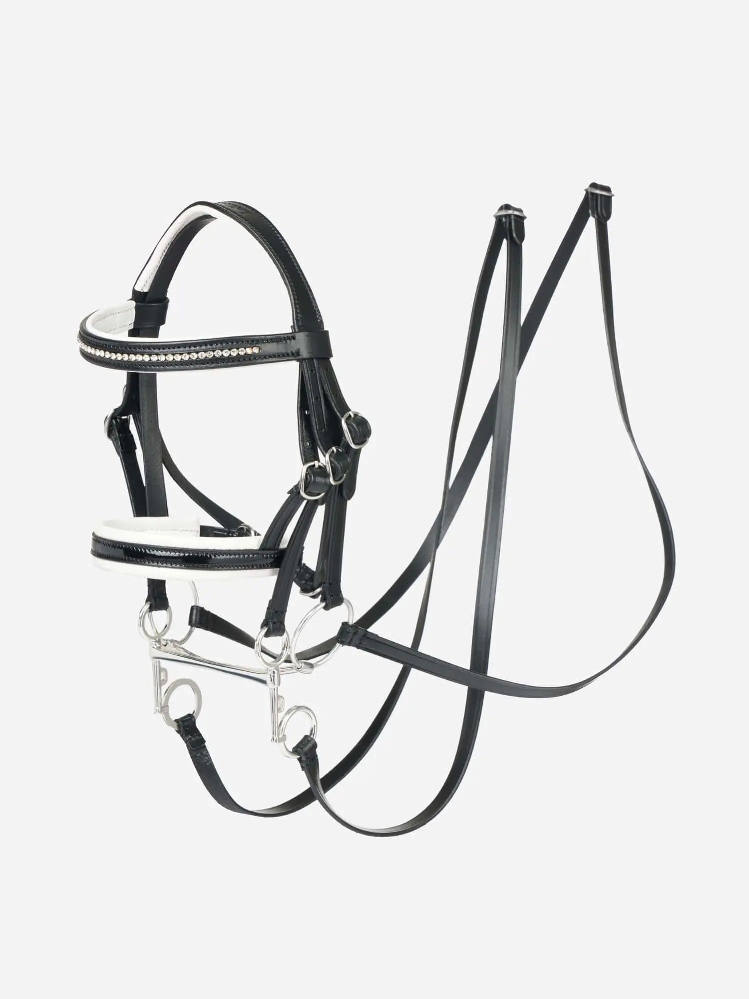 The crystal padded browband adds a touch of elegance, while the soft white and black patent leather noseband gives an authentic dressage look.