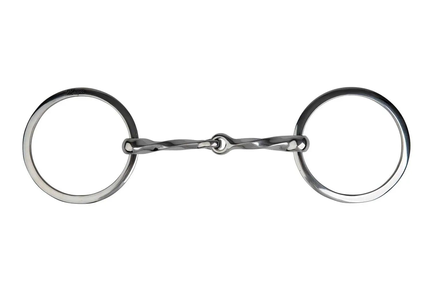 In stainless steel, twisted snaffle, single joint, flat rings.