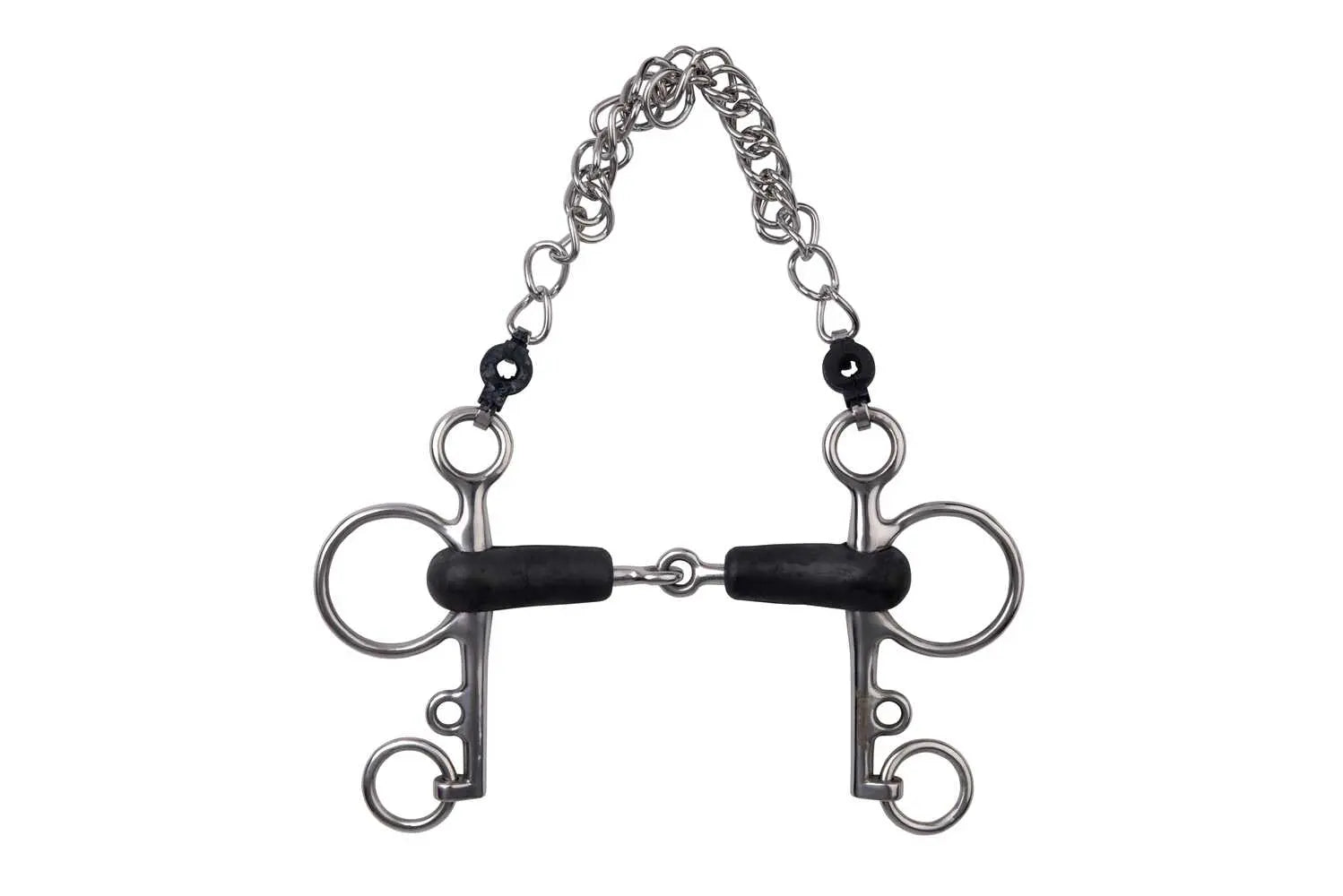 Stainless steel, rigid rubber snaffle, single joint. Short branches.