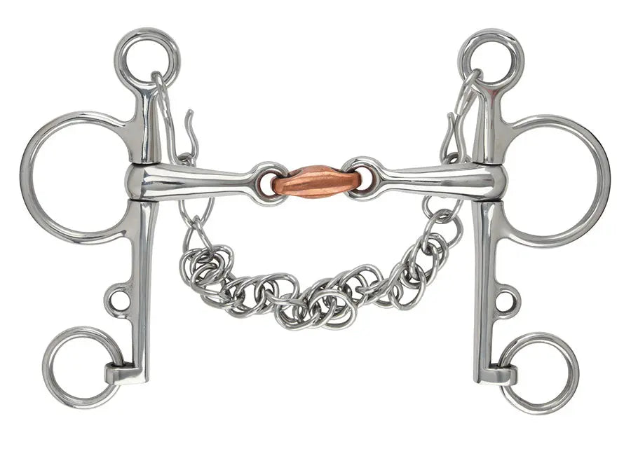 The copper lozenge on this Pelham helps to improve softness and can prevent the horse from becoming wooden in the hand. As copper rapidly warms to body temperature, many horses will soften and relax on the bit.