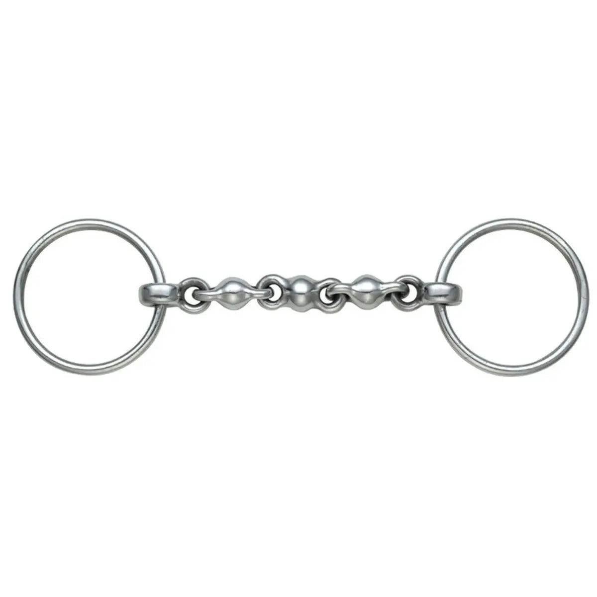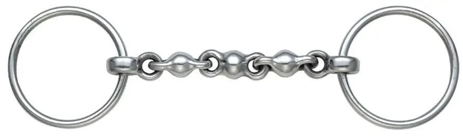 The Shires Loose Ring Waterford Bit is designed to prevent horses from leaning or taking a hold on the bit. It features a Waterford mouthpiece is made up of many different links, making this mouthpiece fully flexible so that the horse has nothing to grab and hold on to. The loose rings ensure further movement of the bit in the horse's mouth. This bit should be used by experienced riders or under supervision of a qualified trainer or instructor.