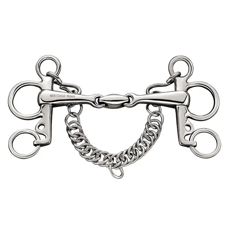 The Sprenger MAX-Control Pelham, or "Danger Pelham" features a double jointed mouthpiece which locks at a certain angle, becoming a straight bar. This bit is designed to lie very well in the mouth when the horse is working properly. When the horse gets strong or opposes the rider's rein aids, the more intensive rigid effect occurs. It then unlocks immediately when the contact is softened, instantly rewarding the horse for the correct reaction.