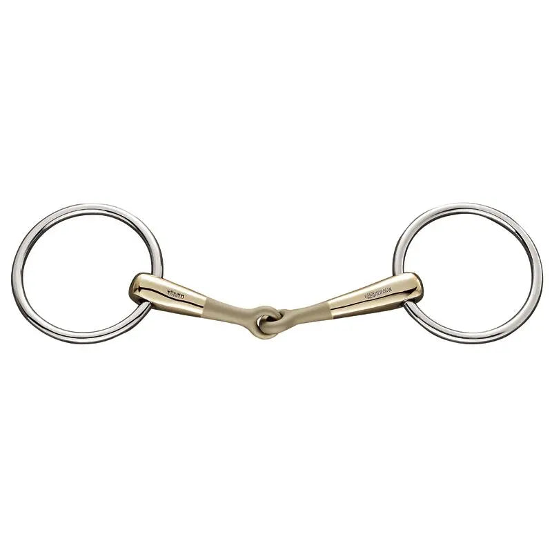 The mouthpiece on this bit is turned forward by 45 degrees and has a slightly abrasive surface in the middle part of the mouthpiece. The rein aids reach the horse's mouth precisely, but in a soft way as the pressure is evenly distributed on the tongue. This bit enables perfect communication with the horse and deal chewing activity is proved immediately. Can also help to prevent tongue vices. Made from Aurigan or Sensogan which composes of 85% copper, 4% nickel with zinc for superb oxidation.
